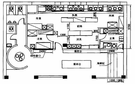 不能設計為獨立的工作間時,也要有相對獨立的功能區域??梢圆捎脽o形的隔斷,例如用冰柜、碗柜、水池排列形成墻,利用設備圍攏形成工作區間。結合實際情況靈活應用,可以,增加自然的采光亮度和通風效果,使工作間寬敞明亮。即使廚房處在沒有自然采光的位置,減少隔斷,或用透明度好的玻璃隔斷,也有利于照明和視距,節省照明用電便于通行、協調和管理。圖5-6是一個小餐館的廚房的設計圖紙,由于使用的設備比較多,采用了部分無墻隔斷設計。為保持衛生潔凈,在主食加工間、涼菜間設計了隔斷,涼菜間設計了涼菜出餐口,便于出餐,也保證了清潔衛生。涼菜間隔斷可阻擋油煙廢氣、清潔美觀,也隔斷了客人從涼菜出餐口向內觀望的視線。消洗、傳菜間采用了無墻隔斷,使功能區域分割清楚,又便于配合工作。