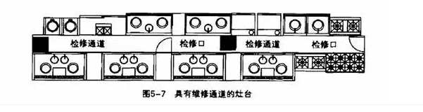 設備維修保養是必不可少的。有條件的廚房應盡量留出設備維修空間或機動的空間。如爐具的用量大、處在高溫潮濕的環境中,容易發生故障,作為主力設備,如發生故障.必須盡快維修。灶臺一般不宜搬動,可設維修通道安裝、檢修、維修、保持衛生清潔。圖5-7是一個大飯店的熱菜間的灶臺一部分,在兩排灶臺之間設計了0.7m凈寬的檢修通道。