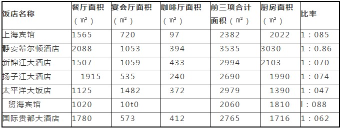 表2 為幾家著名飯店餐廳、宴會廳、咖啡廳與廚房面積統計