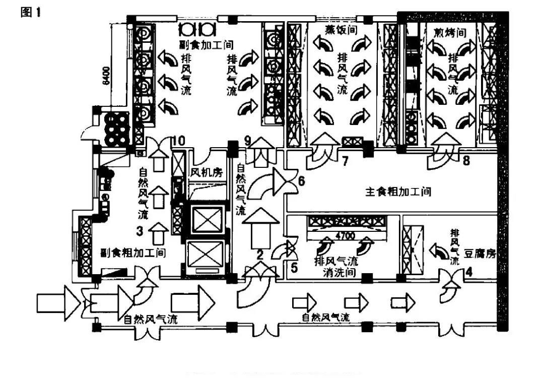 有壓差就會有氣流流動.就像水流動的原理一樣,水的流動要達到水平,空氣流動是要達到與大氣壓力相同。房間內氣壓比大氣壓低,就會有氣流流入,比大氣壓高就會向外流動。與大氣相通的工作間始終要保持大氣壓。排煙罩排風時,氣流流向排罩,圖2中半空心箭頭所示,工作間內和門窗的氣流要自然流入補充進來,平衡負壓。如空心箭頭所示。主副食加工間的排煙罩排風量最大,排風壓力也最大,門窗關閉時,由于流體內任何一點的壓力是各向均等的,在一個房間內的各處壓力也是相等的,負壓就作用在門窗上。離心風機產生的負壓,一般有幾百帕,克服煙道阻力余下的壓力.就作用在廚房內,1Pa=1N/㎡, 1公斤力=9.8N,在工作間內產生的負壓,作用在一扇門上的壓力就很大了,使門開啟困難。