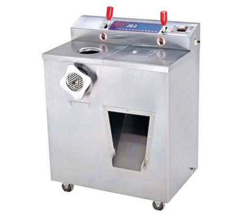 絞肉機由機架、傳動部件、絞軸、絞刀、孔格柵組成。機架為一箱體,傳動也很簡單,電動機輸出皮帶輪經一級減速,把動力傳遞給絞軸旋轉。絞軸是一根螺旋推進軸,用以輸送肉塊。絞刀連同絞軸一起旋轉,在絞刀與軸之間有剪切柵板。絞刀另一側是輸出肉餡的孔格柵。使用時要把肉分割成小塊并去皮去骨,再由入口投進絞肉機中,啟動機器后在孔格柵擠出肉餡。肉餡的粗細可由絞肉的次數來決定,反復絞幾次,肉餡則更加細碎。該機還可用于絞切各類蔬菜、水果、干面包碎等,使用方便,用途很廣。