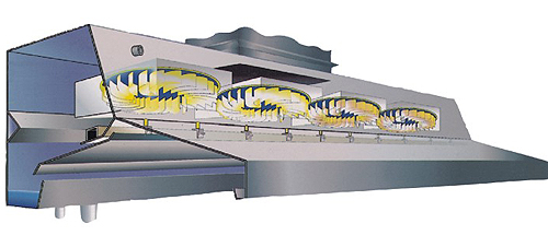 在風機葉片上設置特殊水霧化結構,在引風的同時,霧化洗滌液體,凈化流經風機的油煙。由于霧化密度、粒度與轉速相關,當風機轉速較低時霧化效果下降,轉速高時,霧化效果和凈化效果要好一些。水循環需要水泵配合。對風機増加水循環結構,必須采用耐腐蝕材質,在風機前的管道內仍然有積油,消防的效果要差一點。在北方冬季室外運行存在設備防凍問題。