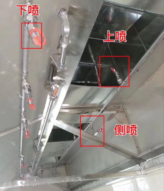 d.當(dāng)系統(tǒng)藥劑噴完大約2-5秒后,系統(tǒng)上的閥門自動將噴水閥門打開。水流通過滅火劑管道和噴嘴噴灑,迅速冷卻和沖刷油料及灶臺設(shè)備表面。