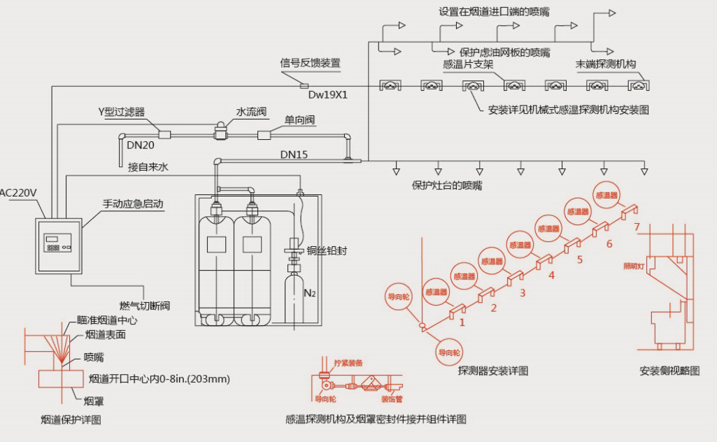 b.感溫探測系統(tǒng)將廚房滅火系統(tǒng)的釋放裝置打開,向滅火劑儲存容器加壓,并同時動作所有輔助氣動或電動的切斷裝置、及報警聯(lián)動裝置。