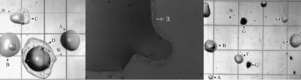 如圖所示,油煙顆粒物主要有常規液態油粒(A)、油包食材渣(B)、油水混合(C)、水包油(D)、油包水(F)等,除此之外還有固態顆粒(G)等形態。