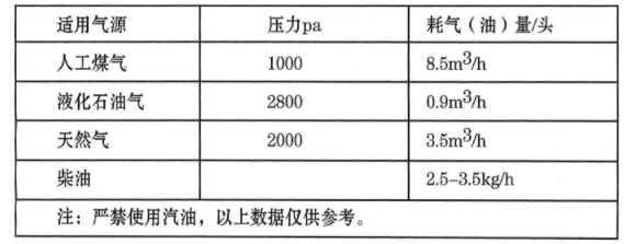 4、耗氣(油)量及燃氣壓力