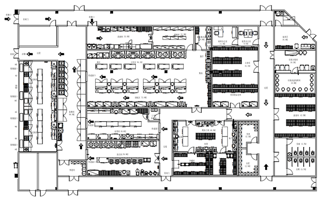 3.消防要求及考慮串味問題,廚房墻體必須砌筑到樓板底皮,餐飲廚房面積超過60㎡,必須裝設兩扇甲級防火疏散門;