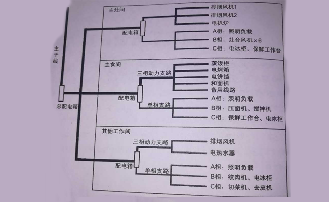一般酒店的廚房供電系統用電負荷分為單相負荷和三相負荷。單相負荷主要為照明電源、單相插座以及其他額定電壓為220V的電器供電。其特點為用電負荷的額定電壓均為單相220V.若均勻分布到A、B、C三相,這類負荷也叫做相負荷。一般分為兩個獨立的系統:照明系統和22V單相負荷動力系統。380V三相負荷分別供電到各個工作間。額定電壓為380V的動力支路主要供蒸飯柜、傳菜電梯、電熱開水器、排煙風