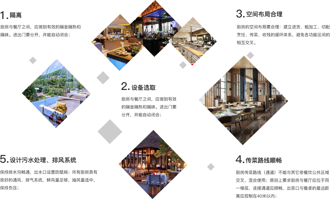 酒店廚房應具備加工間、制作間、備餐間、庫房、洗碗消毒間、廚師長辦公室及廚工服務用房等。 優佰特對布局、路線、分區、排水等方面均按照國家相關法律法規進行設計,考慮到餐飲的生產, 從原材料的采購、收貨、入庫、存儲、保管到出庫、粗加工、切配、烹飪、裝盤出品等多方面進 行設計。應關注以下幾個方面:根據生產、出品的次序布局; 避免進、出廚房的物流產生交叉與 回流;避免人流與物流的交叉及員工流與客流的交叉;盡量縮短員工制作菜肴的行走路線;注意 潔、污,生、熟的分區;廚房的所有排水須經過隔油池隔除油污后方可排放出。